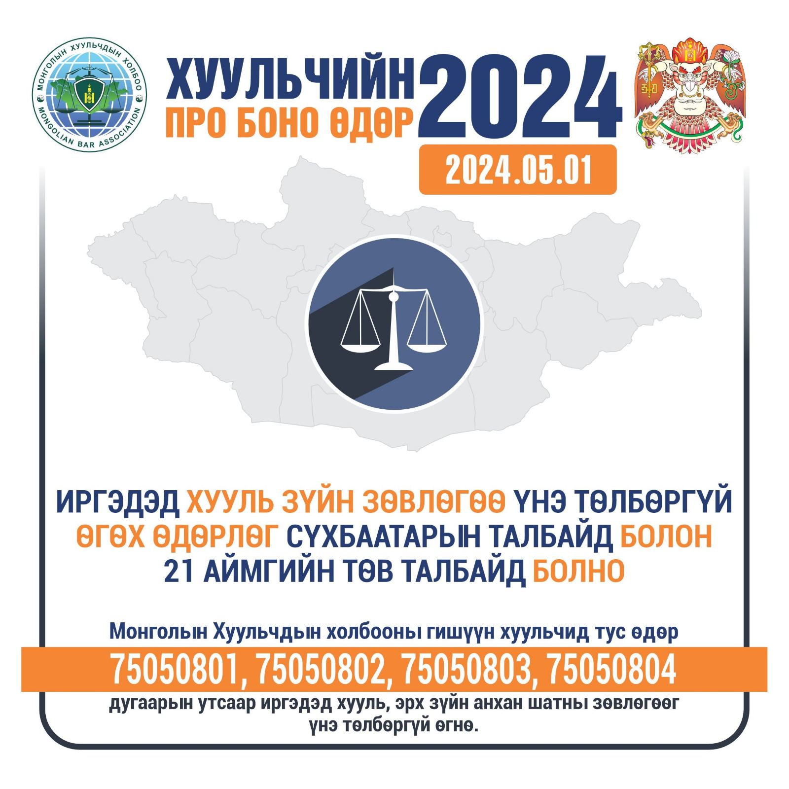 Нийслэлийн Засаг даргын Тамгын газар, Монголын Хуульчдын холбоотой хамтран иргэдийн эрх, хууль ёсны ашиг сонирхлыг хамгаалах зорилгоор хууль зүйн үнэ төлбөргүй зөвлөгөө өгөх “Хуульчийн Про Боно өдөр-2024” өдөрлөгийг 2024 оны тавдугаар сарын 01-ний өдөр жанжин Д.Сүхбаатарын талбайд 10:00-17:00 цагийн хооронд зохион байгуулна. Өдөрлөгт Монголын Хуульчдын холбооны гишүүдээс гадна Шүүхийн ерөнхий зөвлөл, Улсын ерөнхий прокурорын газар, Монгол Улсын Хүний эрхийн үндэсний комисс, Хууль зүй, дотоод хэргийн яам, Цагдаагийн ерөнхий газар, Шүүхийн шийдвэр гүйцэтгэх ерөнхий газар, Улсын бүртгэлийн ерөнхий газар, Архивын ерөнхий газар, Монголын Өмгөөлөгчдийн холбоо, Монголын Нотариатчидын танхим зэрэг байгууллагууд оролцож, иргэдэд үнэ төлбөргүй зөвлөгөө мэдээлэл өгнө. Иргэд та бүхэн Сүхбаатарын талбайд зохион байгуулж буй өдөрлөгт болон Нийслэлийн Үйлчилгээний нэгдсэн төвийн салбаруудад /Мишээл, Драгон, Дүнжингарав, Баянгол, Баянхошуу, Сэлбэ/ хүрэлцэн ирж, мөн 75050801, 75050802, 75050803, 75050804 дугаарын утаснуудад холбогдож өөрт хэрэгтэй хууль, эрх зүйн зөвлөгөө, мэдээллийг авах боломжтой.